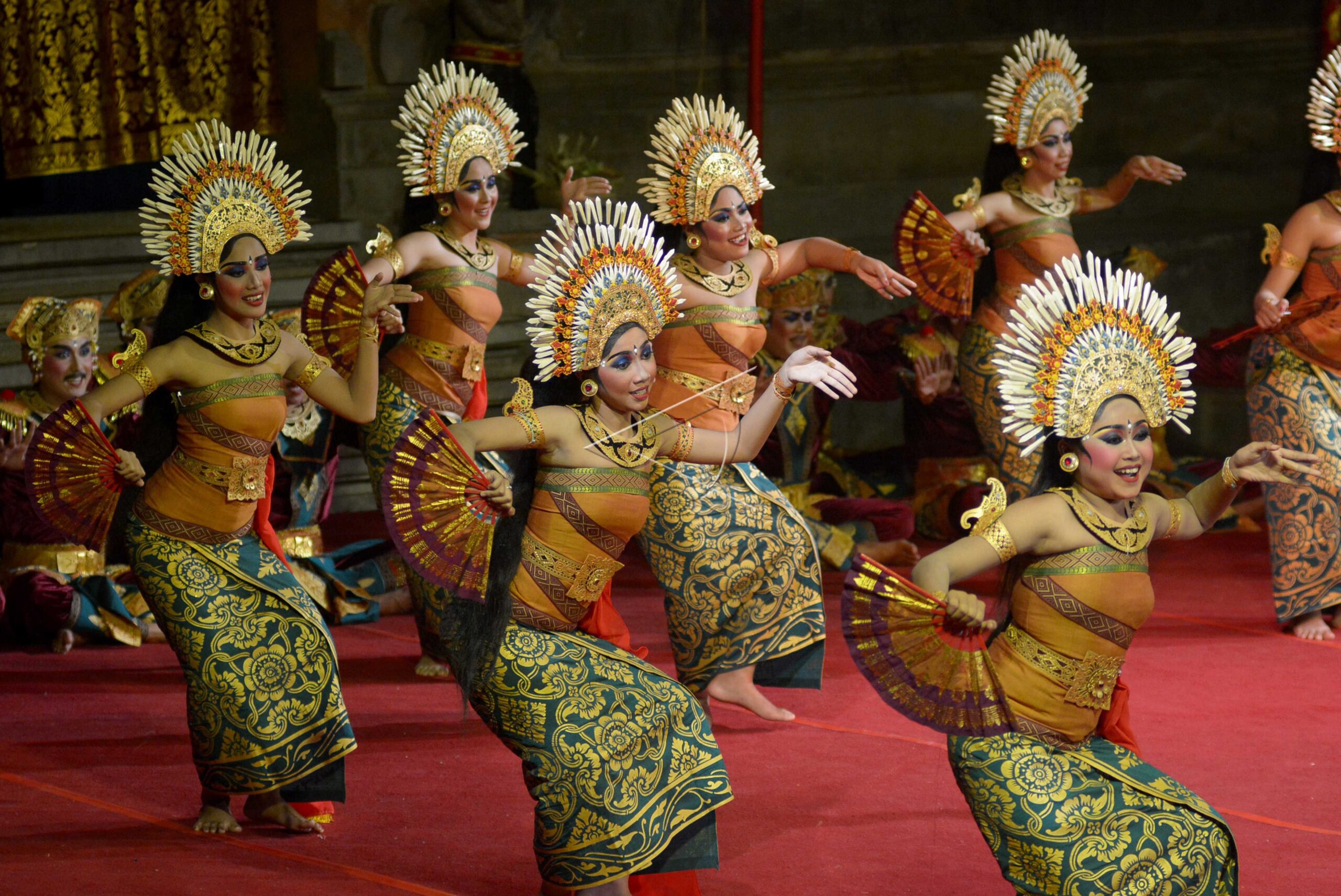 Penari menarikan Tari Janger dalam gelar seni kerakyatan Bali Mandara Mahalango 2018 di Taman Budaya Denpasar, Bali, Selasa (21/8/2018). ANTARA FOTO/Wira Suryantala/ama/dw/wpa.