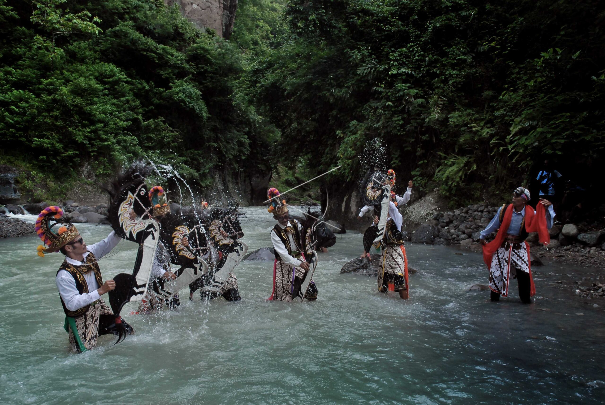 Penari jatilan melakukan prosesi tradisi Guyang Jaran Kepang di Bendung Kayangan, Kulonprogo, Yogyakarta, Rabu (30/11/2016). ANTARA FOTO/Hanung Hambara/tom/aww/dw/wpa.