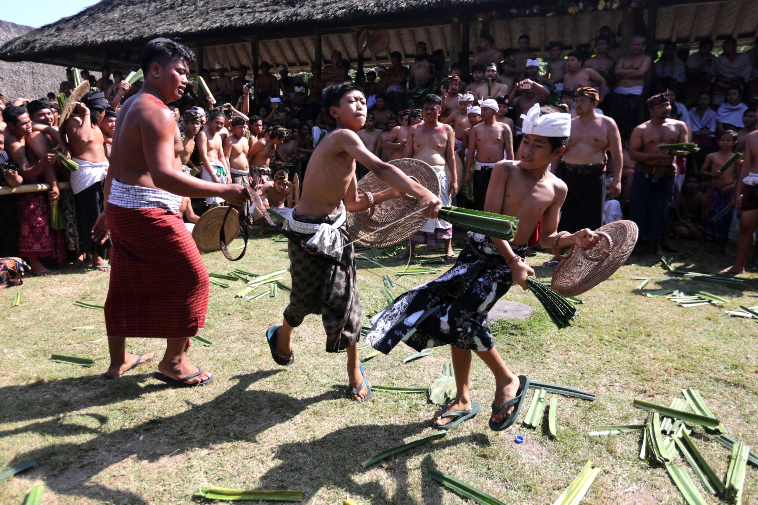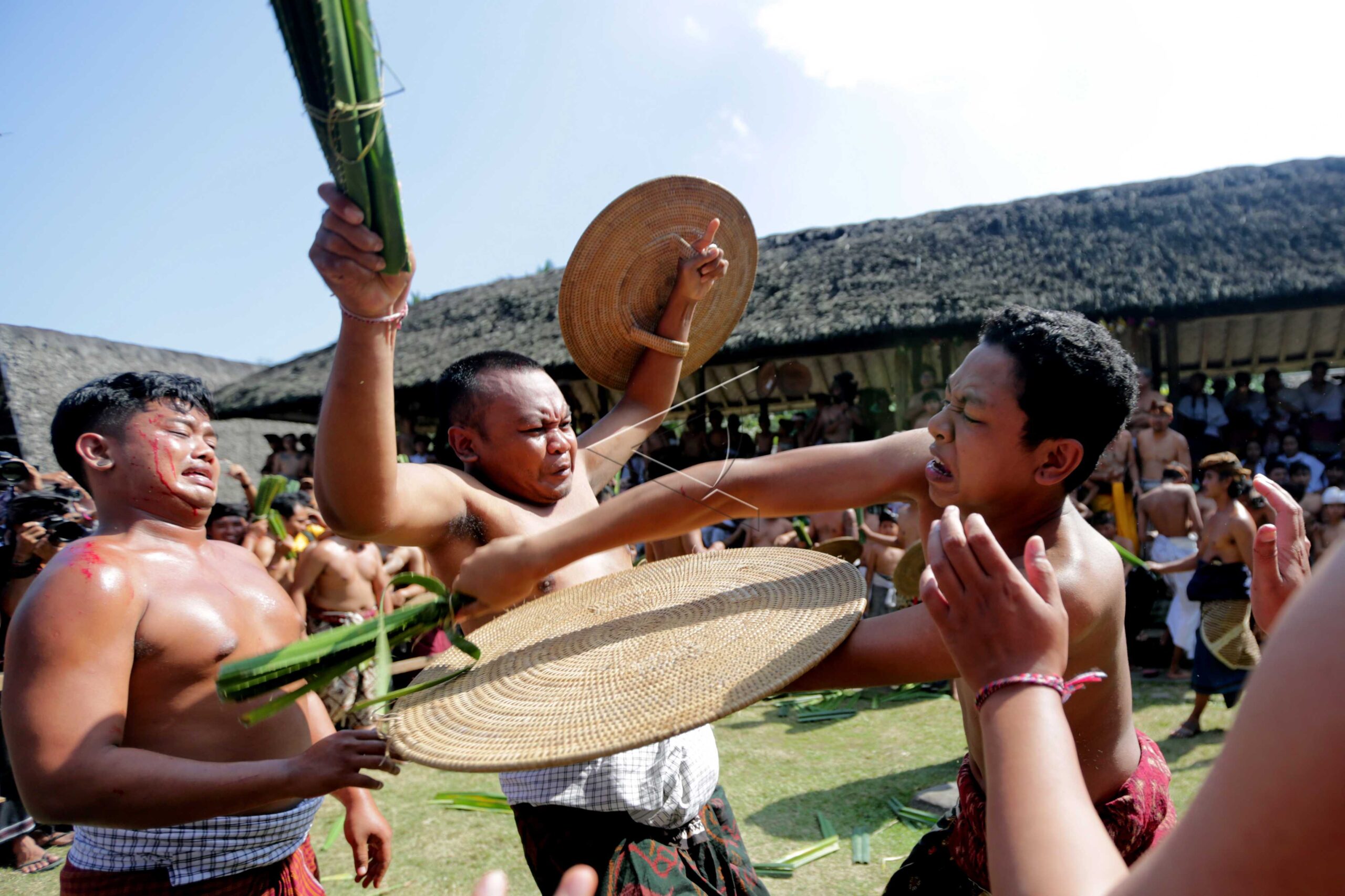 Dua warga saling menyerang dengan daun pandan berduri saat tradisi Makare-Kare atau perang pandan untuk menghormati dewa Indra atau dewa perang sekaligus memupuk persaudaraan di Desa Tenganan Pegringsingan, Karangasem, Bali, Senin (24/6/2019). ANTARA FOTO / Irwansyah Putra/ama/dw/nym.