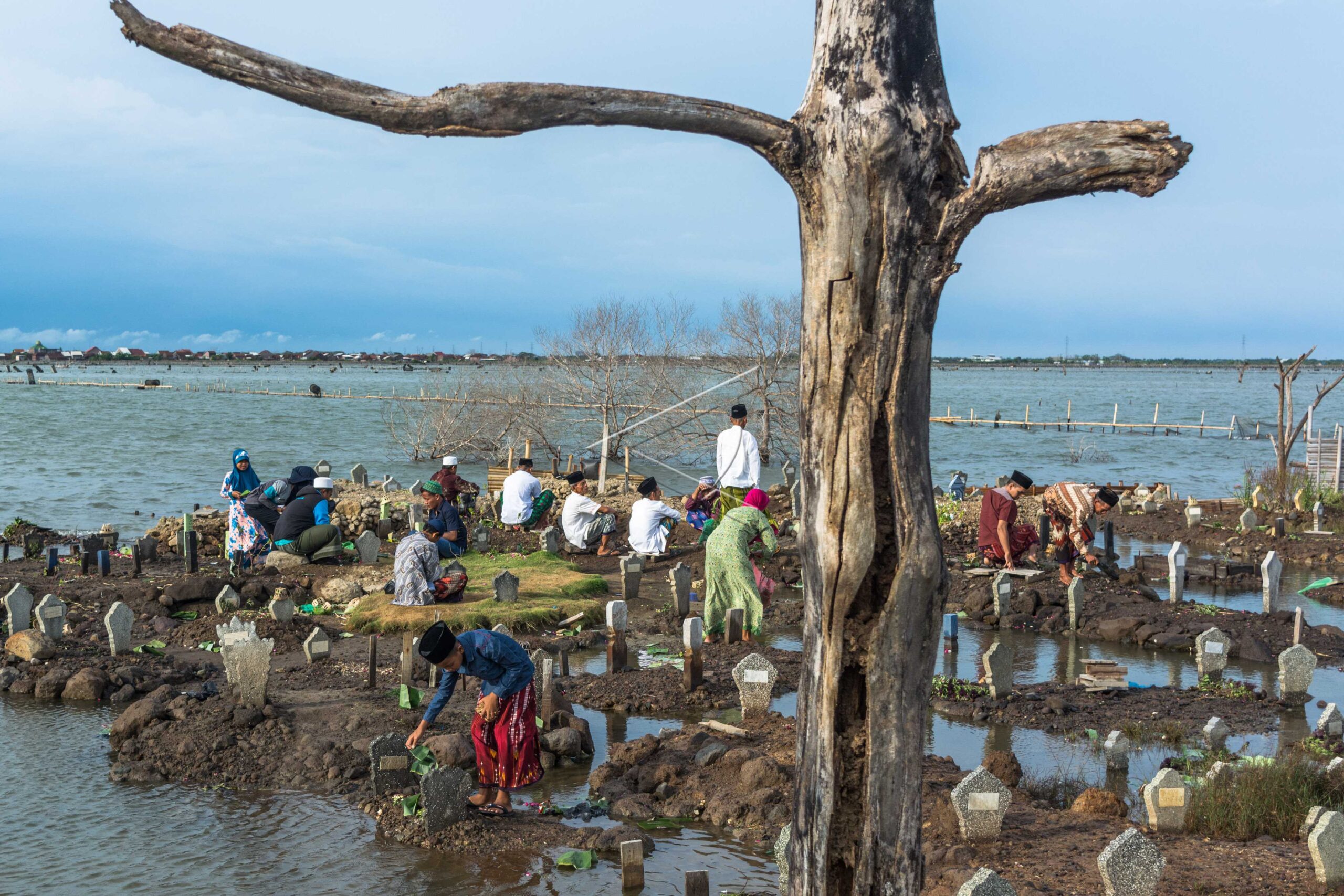 Sejumlah peziarah berdoa di makam yang terendam air rob di Taman Pemakaman Umum Badong menjelang Idul Fitri di pesisir Desa Sidogemah, Sayung, Demak, Jawa Tengah, Sabtu (24/6/2017). ANTARA FOTO/Aji Styawan/ama/dw/nym.