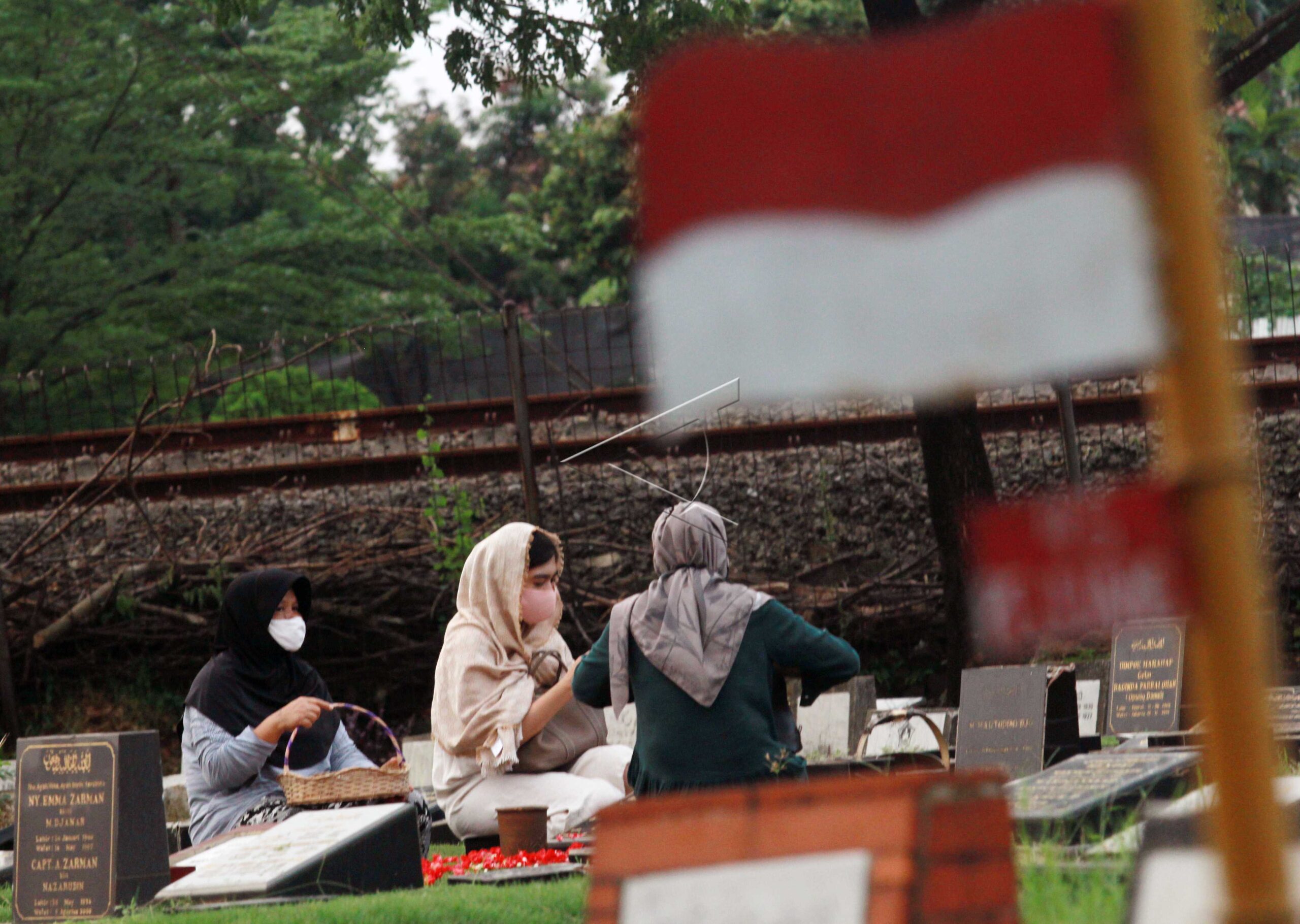 Sejumlah warga berdoa di makam keluarganya di Tempat Pemakaman Umum (TPU) Tanah Kusir, Jakarta, Jumat (17/4/2020). Sepekan jelang datangnya bulan suci Ramadhan, banyak warga yang melakukan tradisi ziarah kubur untuk mendoakan dan berdoa untuk diberikan kesehatan dalam menjalankan ibadah Ramadhan. ANTARA FOTO/Muhammad Iqbal/wsj.