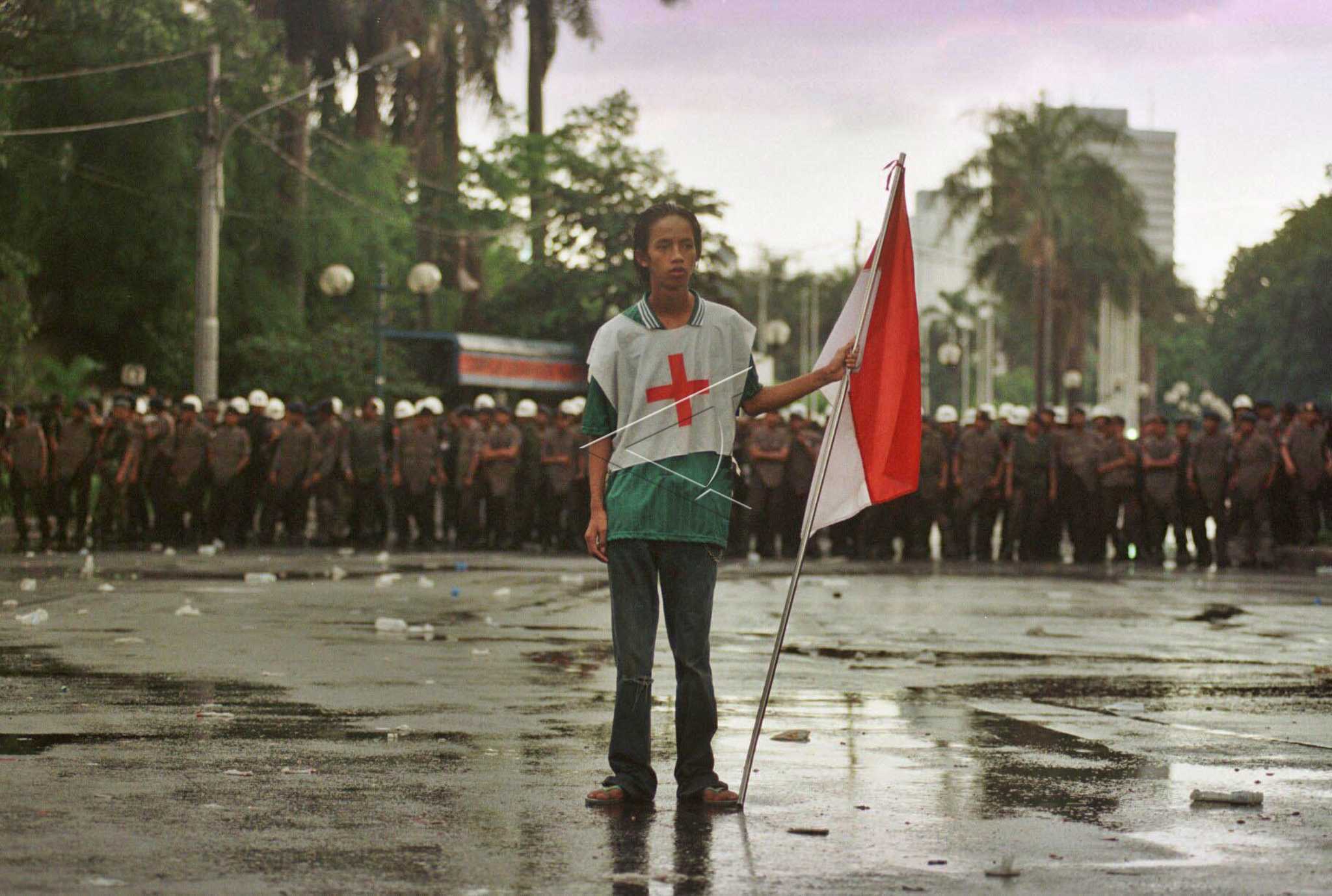 Seorang relawan menunggu rekan-rekannya untuk mundur dari garis depan dalam unjuk rasa mahasiswa di Departemen Luar Negeri, Jakarta, Kamis (10/12/1998). ANTARA FOTO/Mosista Pambudi/asf/tom.