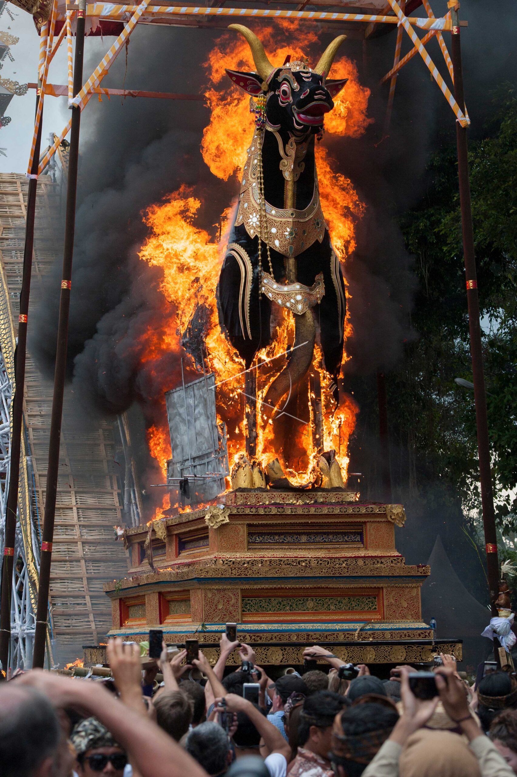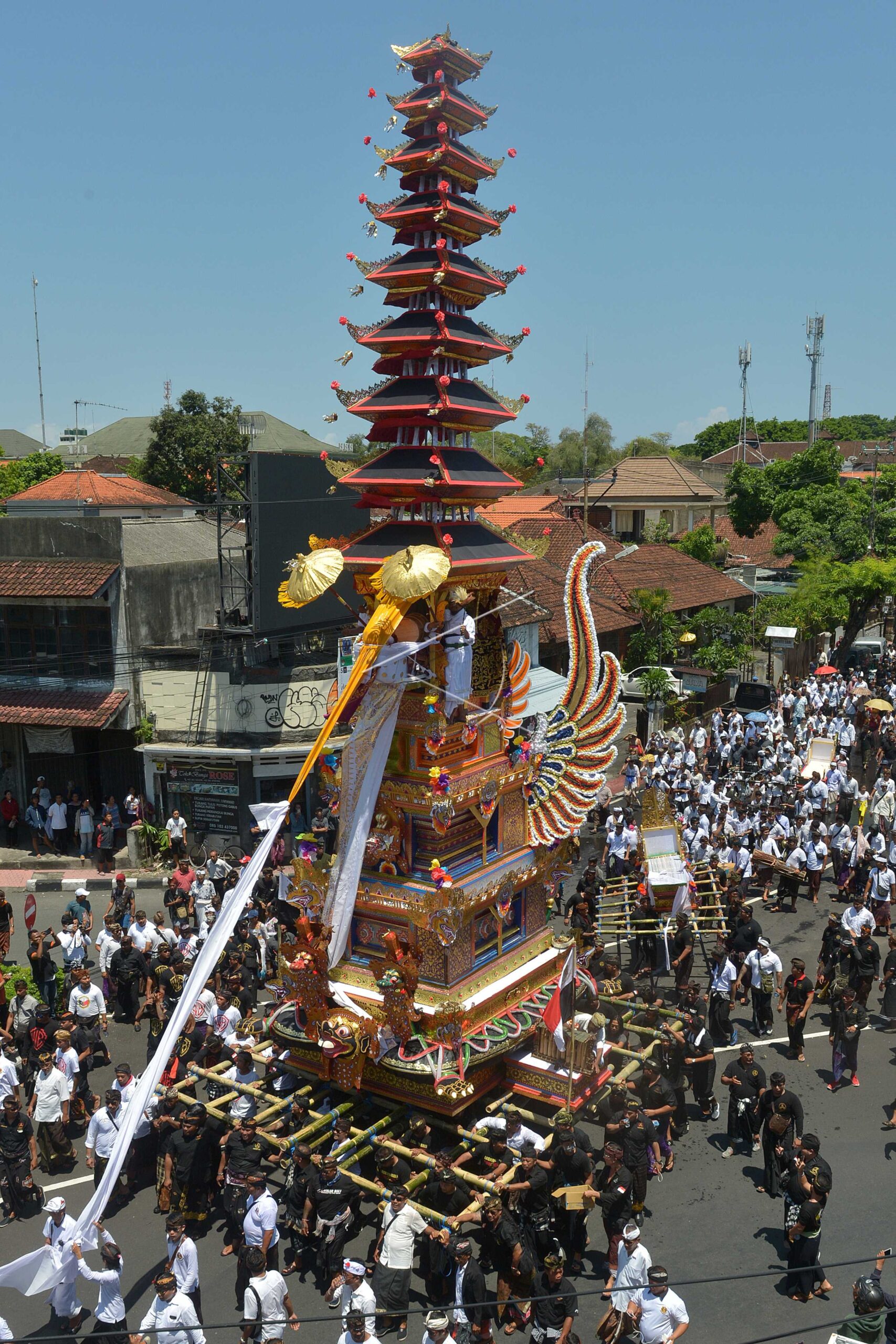 Ribuan warga mengarak “Bade” atau menara bertingkat sembilan yang berisi jenazah tokoh Puri (kerajaan) Denpasar Ida Anak Agung Ayu Oka Pemecutan saat prosesi Ngaben di Denpasar, Bali, Rabu (14/11/2018). ANTARA FOTO/Nyoman Budhiana/hp.