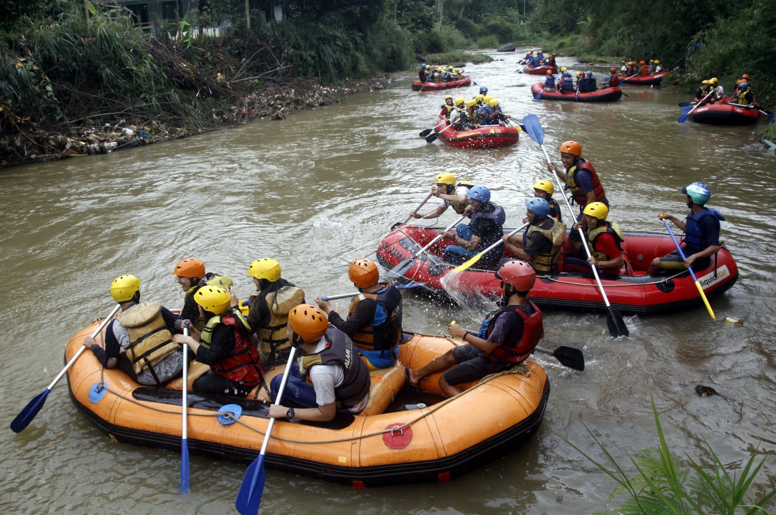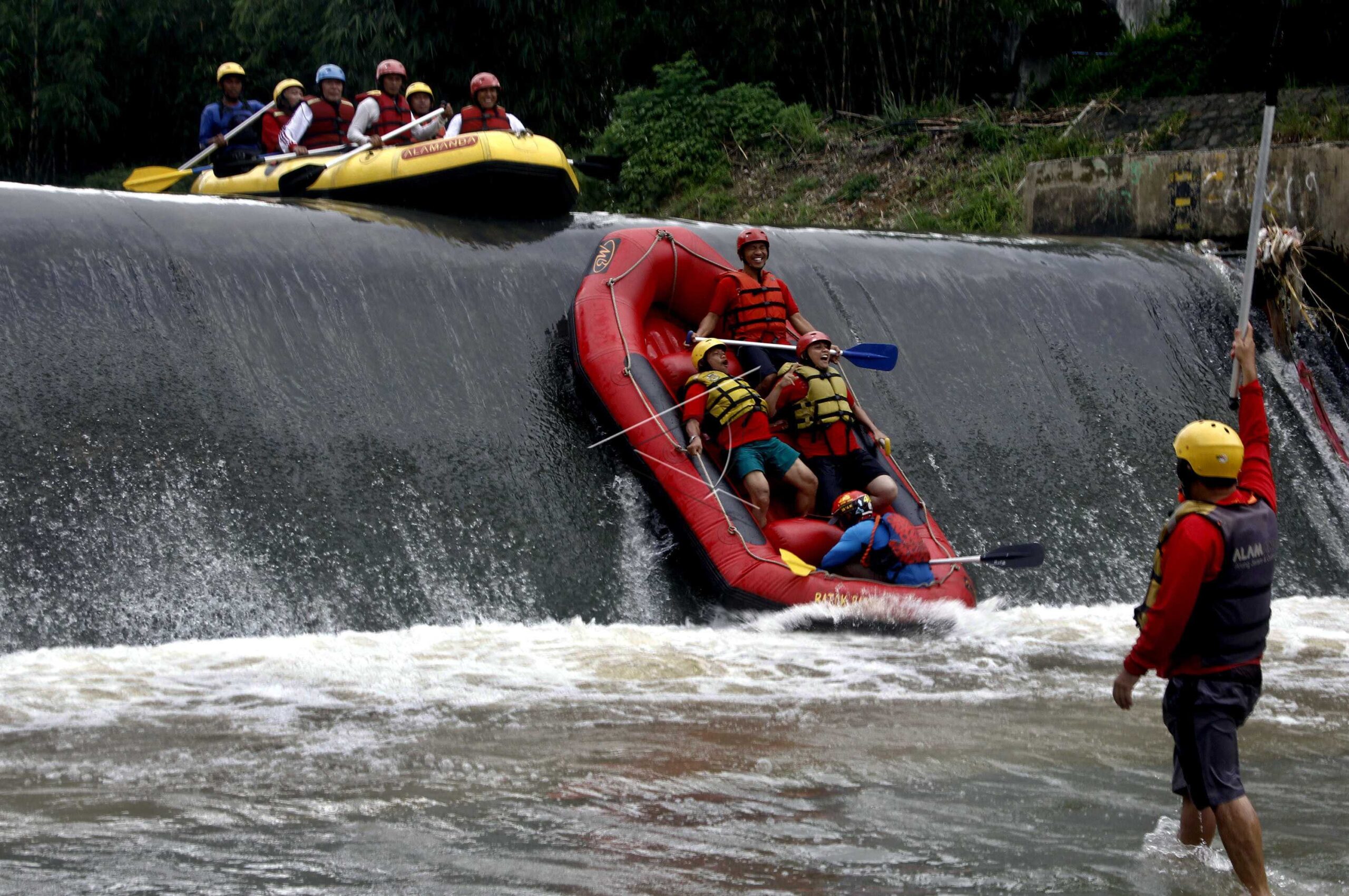 Wisatawan naik perahu karet saat melakukan wisata arung jeram di Sungai Cisadane, Caringin, Kabupaten Bogor, Minggu (1/1/2017). ANTARA FOTO/Yulius Satria Wijaya/dw/tom.