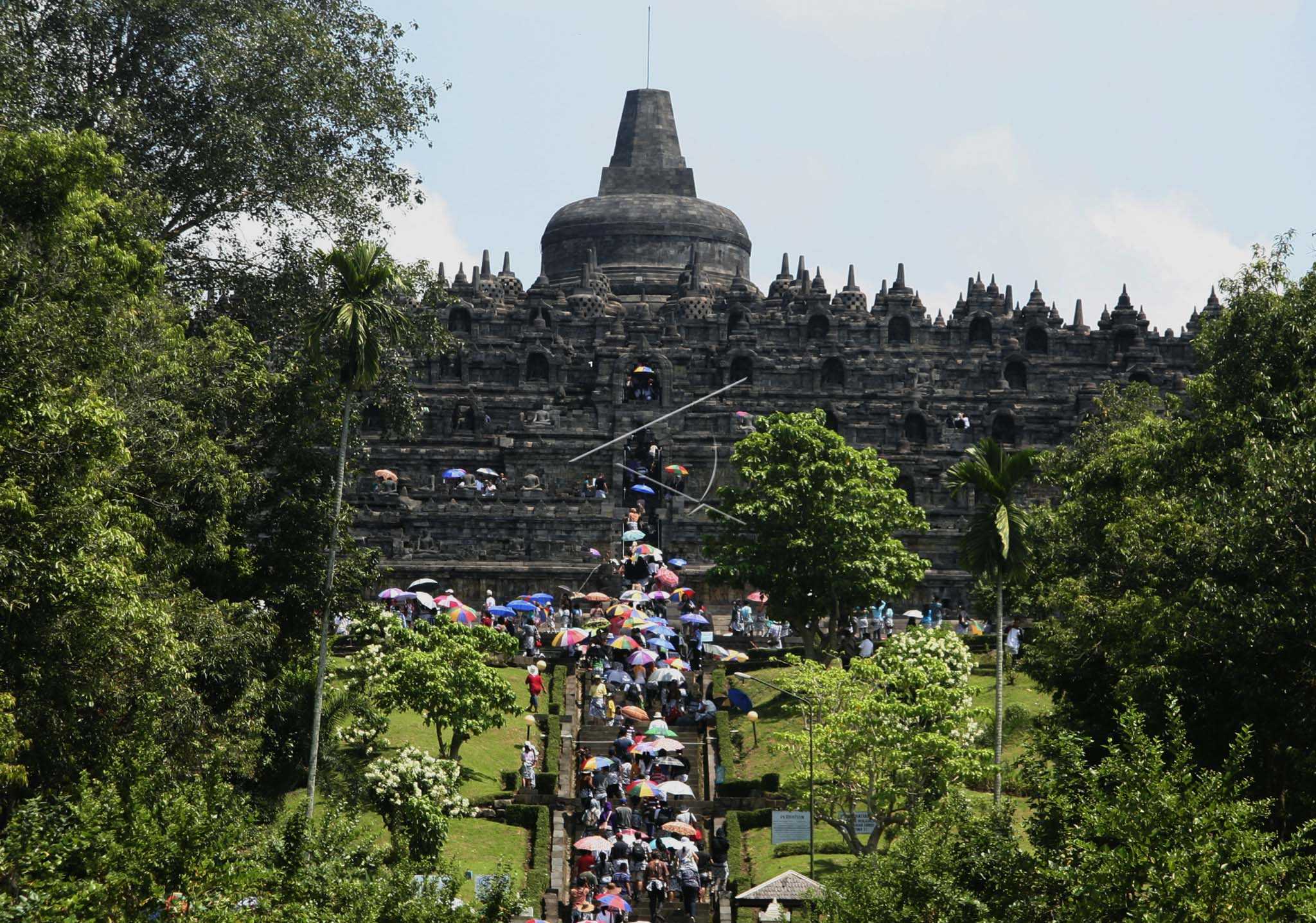 Para wisatawan menaiki tangga menuju Candi Borobudur di Kabupaten Magelang, Jawa Tengah, Sabtu (23/4/2011). ANTARA FOTO/Hari Atmoko/pras/dw.