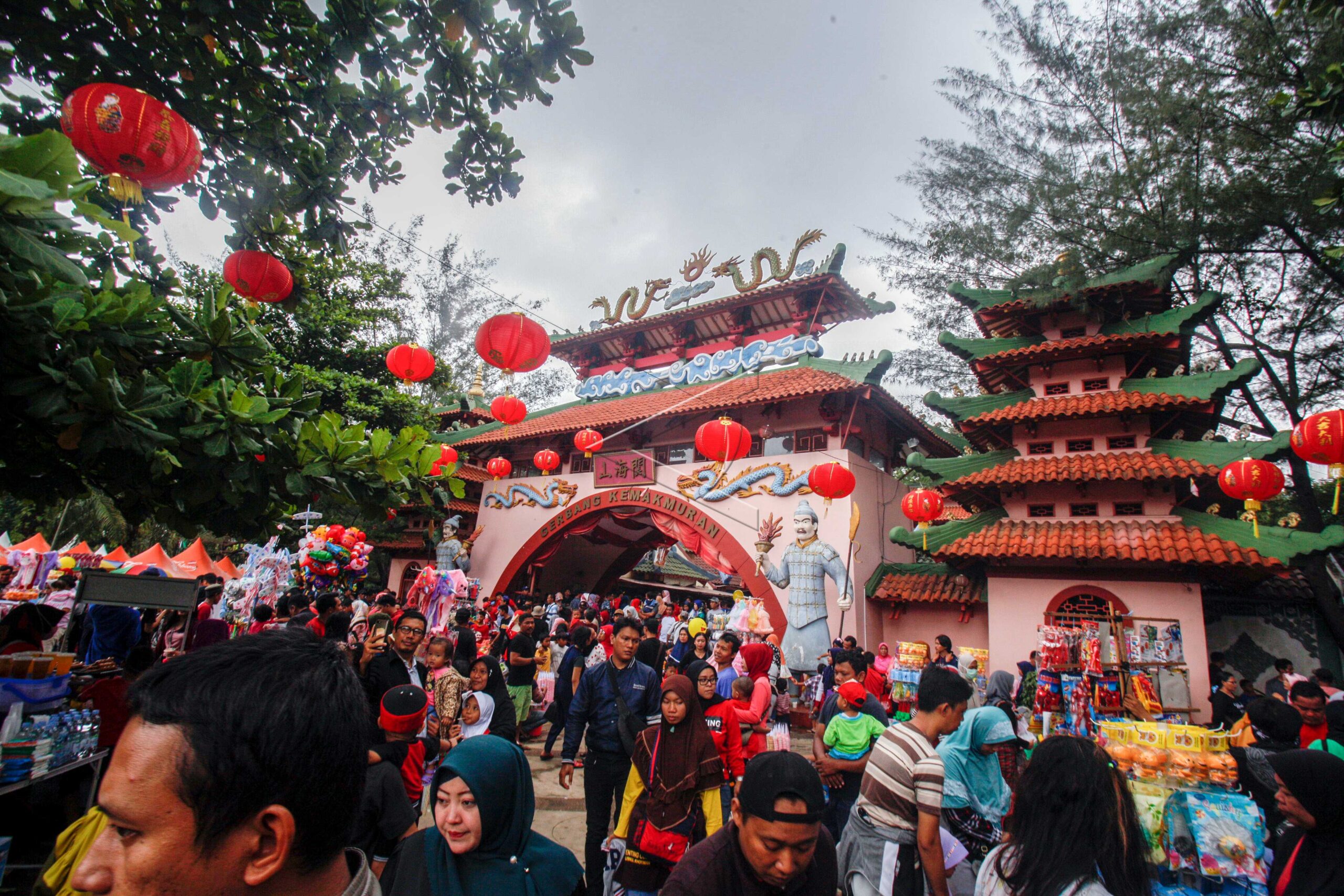 Sejumlah wisatawan memadati Kampung Cina di Cibubur, Bogor, Jawa Barat, Sabtu (25/1/2020). Kampung Cina merupakan salah satu destinasi wisata yang banyak dikunjungi oleh wisatawan lokal pada tahun baru Imlek setiap tahunnya. ANTARA FOTO/Yulius Satria Wijaya/ama.