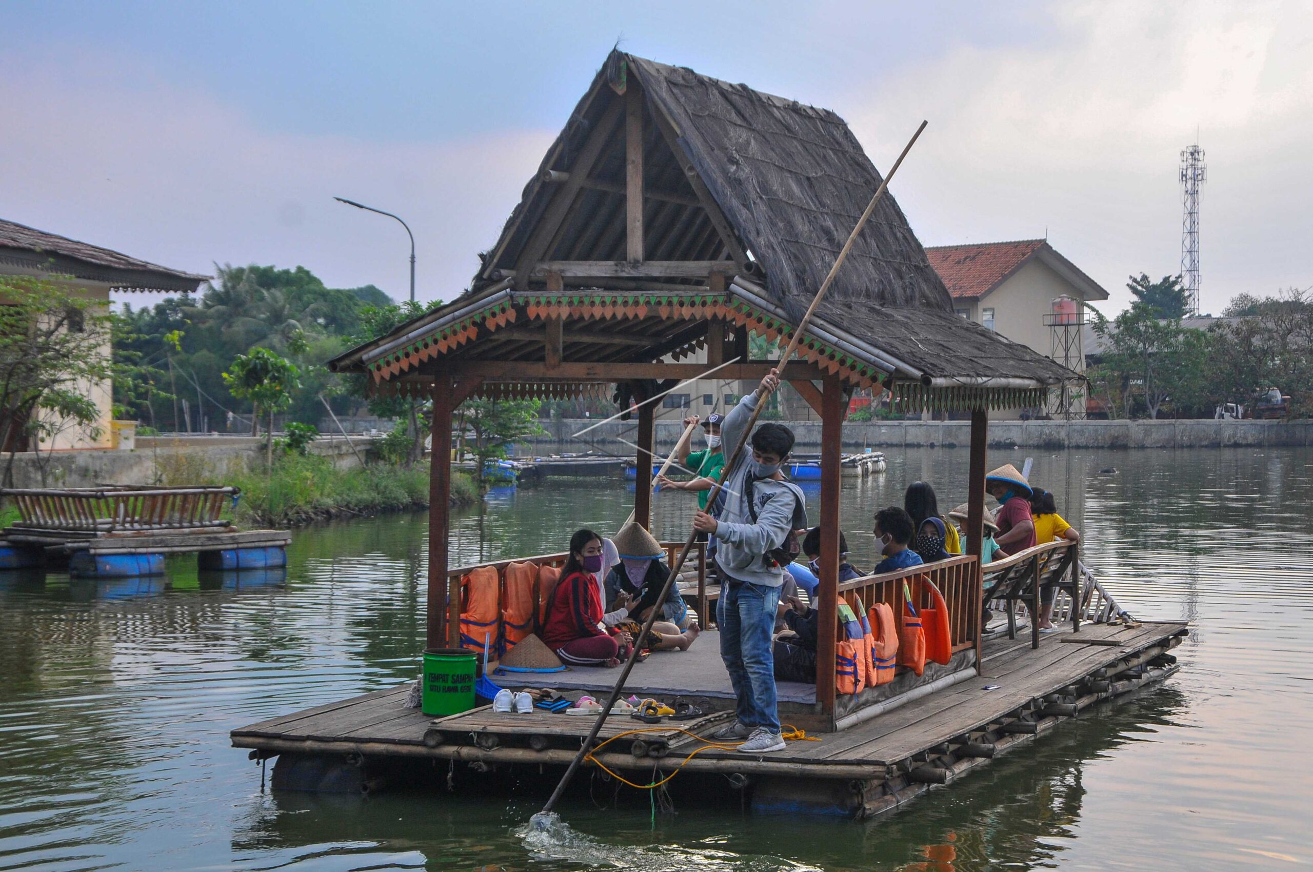 Sejumlah warga berwisata menggunakan perahu di Situ Rawa Gede, Bojong Menteng, Bekasi, Jawa Barat, Minggu (31/5/2020). Pengelola wisata tersebut mewajibkan pengunjung untuk menggunakan masker serta cuci tangan sebagai protokol kesehatan. ANTARA FOTO/ Fakhri Hermansyah/aww.