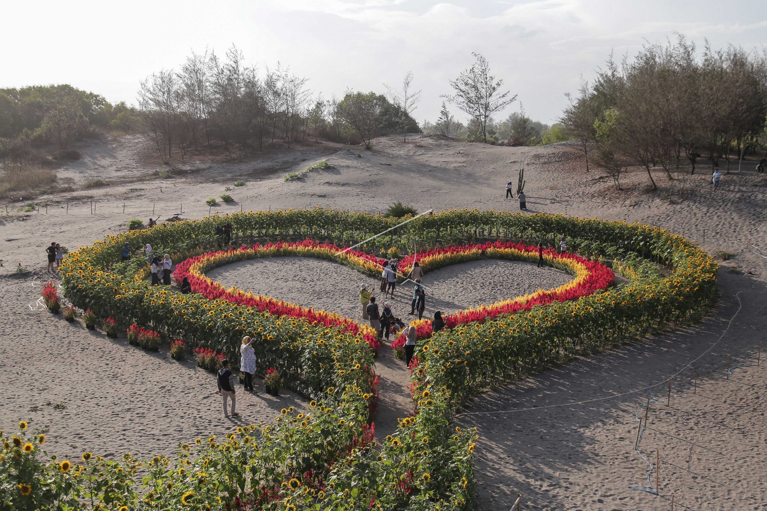 Wisatawan mengunjungi kebun bunga matahari yang ditanam di sekitar Taman Gumuk Pasir Parangtritis, Bantul, DI Yogyakarta, Kamis (21/6/2018). ANTARA FOTO/Hendra Nurdiyansyah/dw/pras.