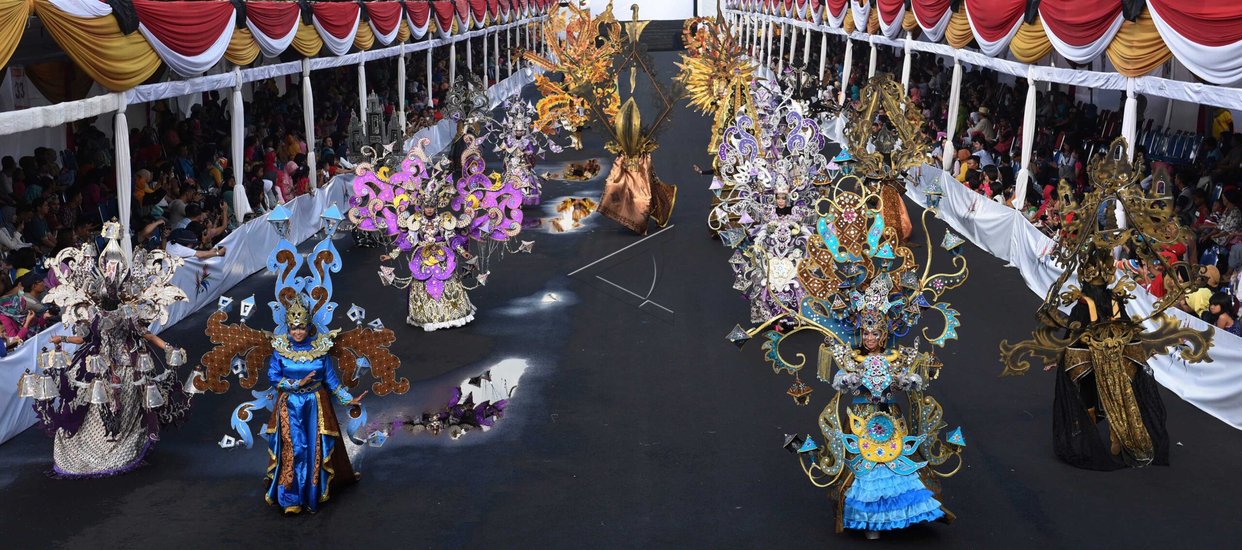 Peserta perwakilan dari Solo Batik Carnival memperagakan busana karnaval dalam kegiatan Wonderful Archipelago Carnival Indonesia yaitu rangkaian Jember Fashion Carnaval Indonesia ke-15 Revival di Jember, Jawa Timur, Sabtu (27/8/2016). ANTARA FOTO/Zabur Karuru/pd/dw/nym.